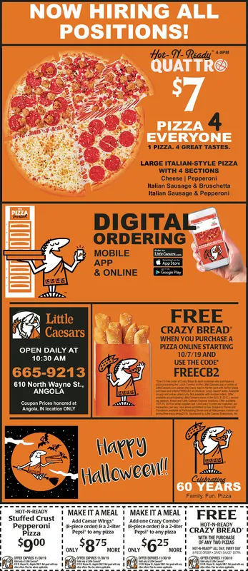 NOW HIRING ALL POSITIONS! Hot-N-Readyu QUATTR $7 PIZZA 4 EVERYONE 1 PIZZA. 4 GREAT TASTES. LARGE ITALIAN-STYLE PIZZA WITH 4 SECTIONS Cheese | Pepperoni Italian Sausage & Bruschetta Italian Sausage & Pepperoni PIZZA DIGITAL ORDERING MOBILE LeCs APP AppStore & ONLINE ge Pay EIELSLS FREE CRAZY BREAD Little Caesars WHEN YOU PURCHASE A PIZZA ONLINE STARTING 21 OPEN DAILY AT 10/7/19 AND 10:30 AM USE THE CODE 665-9213 FREECB2 rroe er 610 North Wayne St., ANGOLA eCaan Coupon Prices honced at Angola, IN location ONLY Harry Halloween! Culabrating 60 YEARS Family Fun. Pizza HOT-N-READY Stuffed Crust Pepperoni Pizza MAKE IT A MEAL MAKE IT A MEAL Add Caesar Wings 8-plece order) & a 2-iter8-plece order 8 a 2-iter Pep to any pizza FREE iAdd one Crary Combo HOT-N-READY CRAZY BREAD WITH THE PURCHASE OF ANY TWO PIZZAS wr ALLOar, EVERY DAY PROOYCD FER PS110 Peps to any pizza $900 $875 $625 IONLY MORE ONLY MORE OFFE EXPRES 11001 NOW HIRING ALL POSITIONS! Hot-N-Readyu QUATTR $7 PIZZA 4 EVERYONE 1 PIZZA. 4 GREAT TASTES. LARGE ITALIAN-STYLE PIZZA WITH 4 SECTIONS Cheese | Pepperoni Italian Sausage & Bruschetta Italian Sausage & Pepperoni PIZZA DIGITAL ORDERING MOBILE LeCs APP AppStore & ONLINE ge Pay EIELSLS FREE CRAZY BREAD Little Caesars WHEN YOU PURCHASE A PIZZA ONLINE STARTING 21 OPEN DAILY AT 10/7/19 AND 10:30 AM USE THE CODE 665-9213 FREECB2 rroe er 610 North Wayne St., ANGOLA eCaan Coupon Prices honced at Angola, IN location ONLY Harry Halloween! Culabrating 60 YEARS Family Fun. Pizza HOT-N-READY Stuffed Crust Pepperoni Pizza MAKE IT A MEAL MAKE IT A MEAL Add Caesar Wings 8-plece order) & a 2-iter8-plece order 8 a 2-iter Pep to any pizza FREE iAdd one Crary Combo HOT-N-READY CRAZY BREAD WITH THE PURCHASE OF ANY TWO PIZZAS wr ALLOar, EVERY DAY PROOYCD FER PS110 Peps to any pizza $900 $875 $625 IONLY MORE ONLY MORE OFFE EXPRES 11001